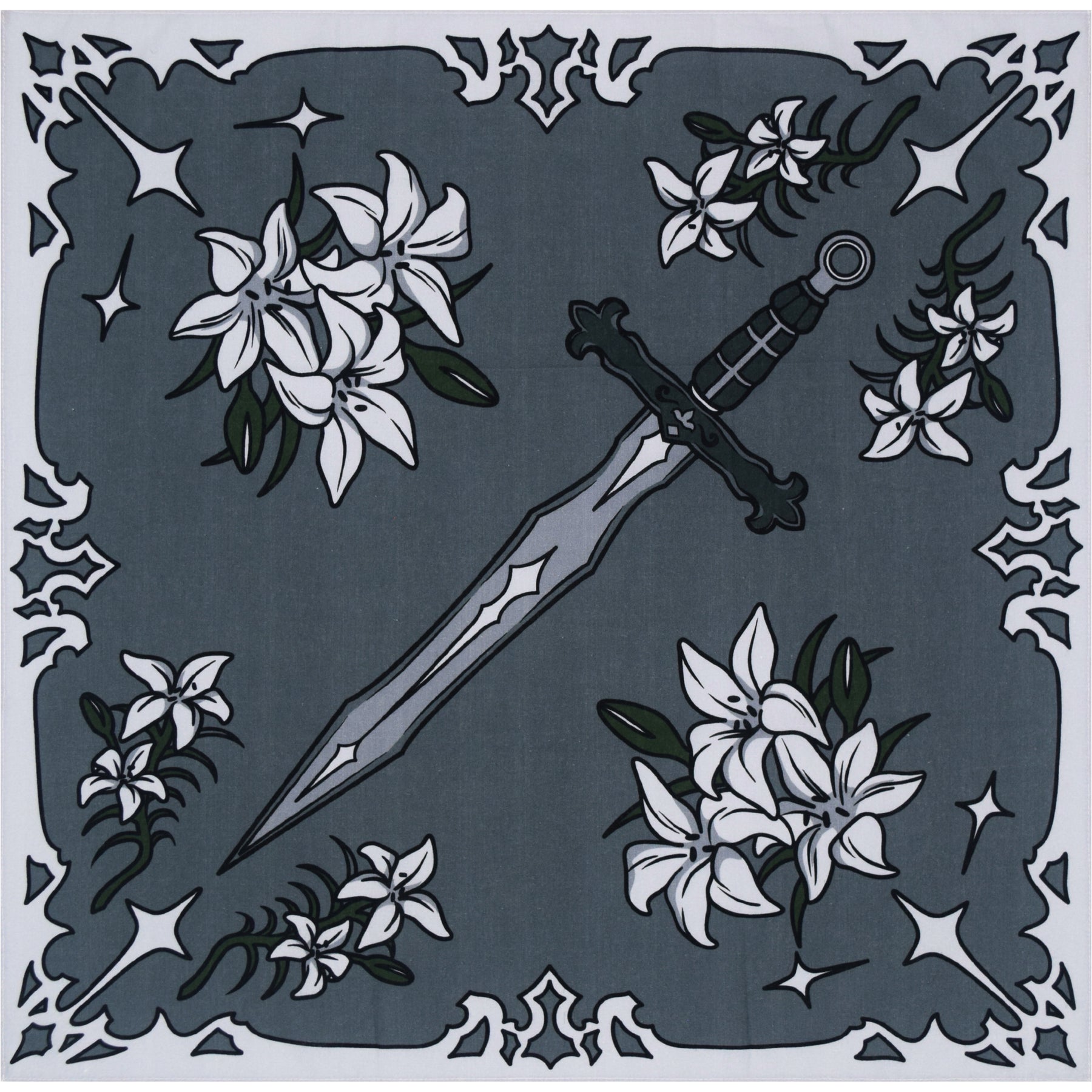 Our interpretation of Jeanne d'Arc's sword, paired with white lilies and sparkles symbolizing a halo in honor of her sainthood.
