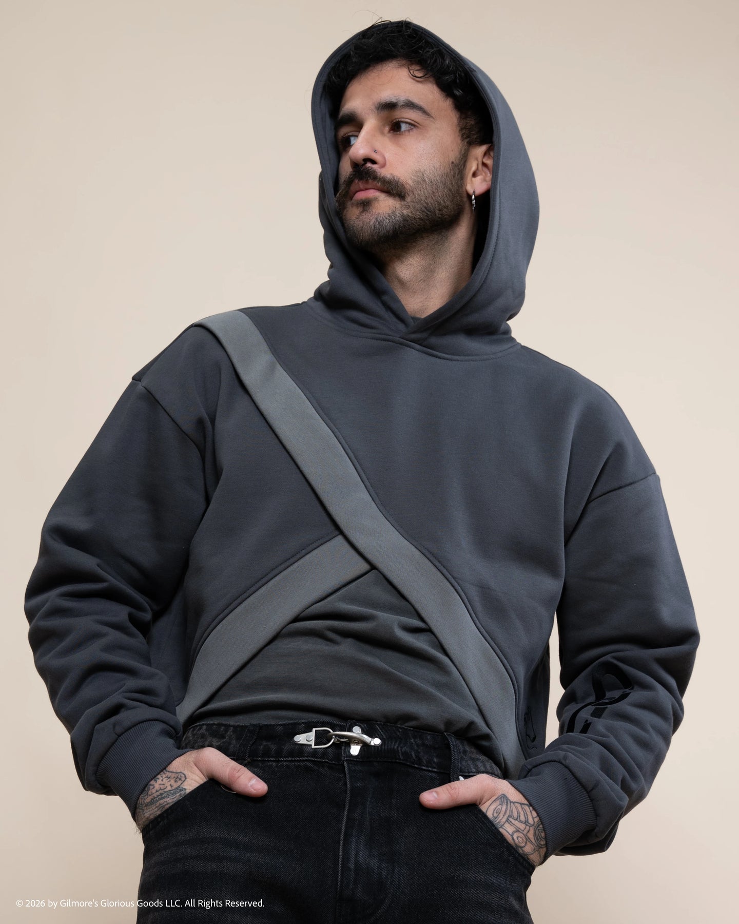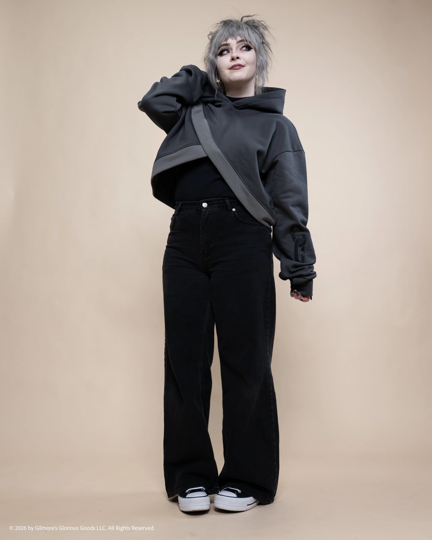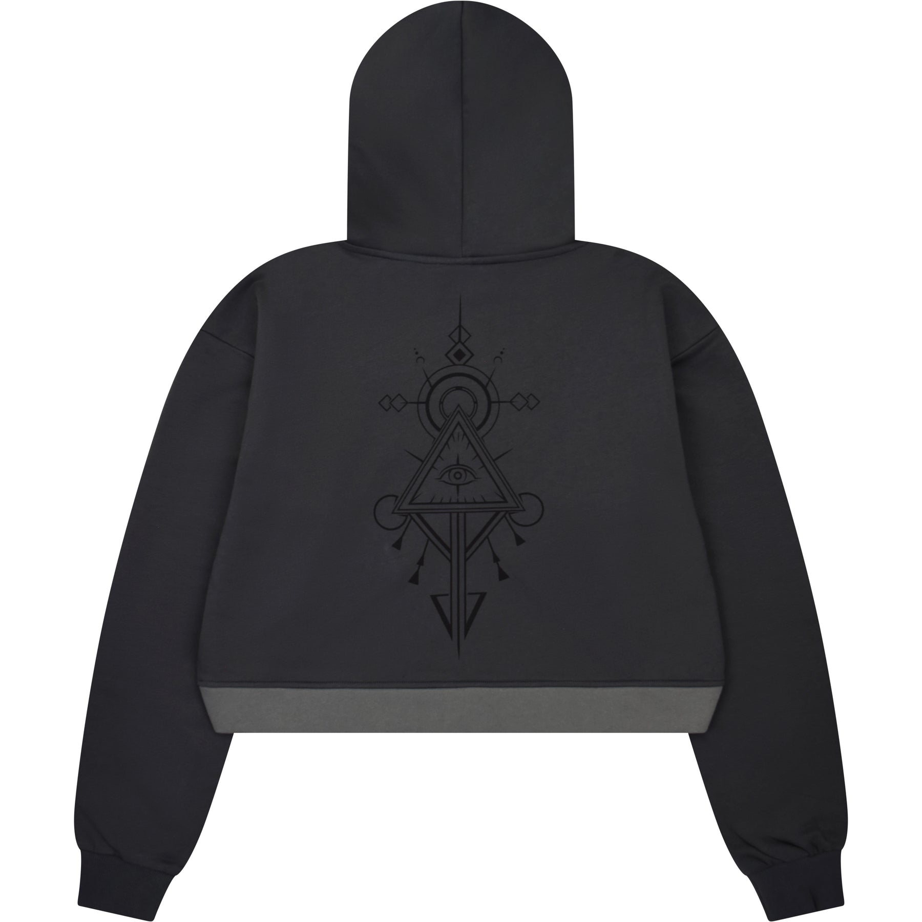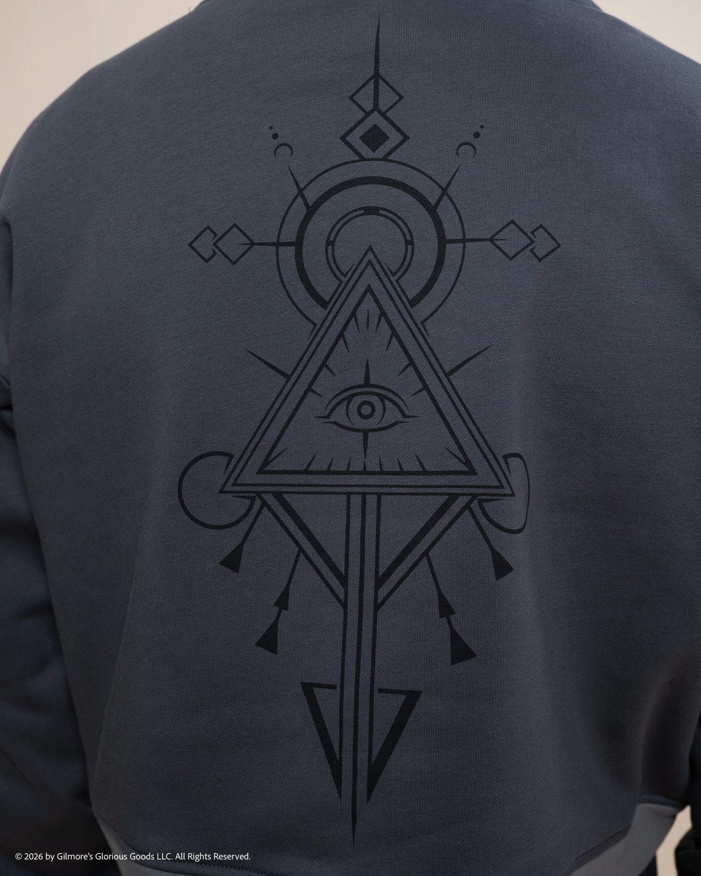 A unique cut hoodie styled after Beauregard Lionett’s Eiselcross outfit featuring her Chaos Crew tattoo embroidered on the sleeve and her jade dust All-Seeing Eye Tattoo printed tonally on the back.