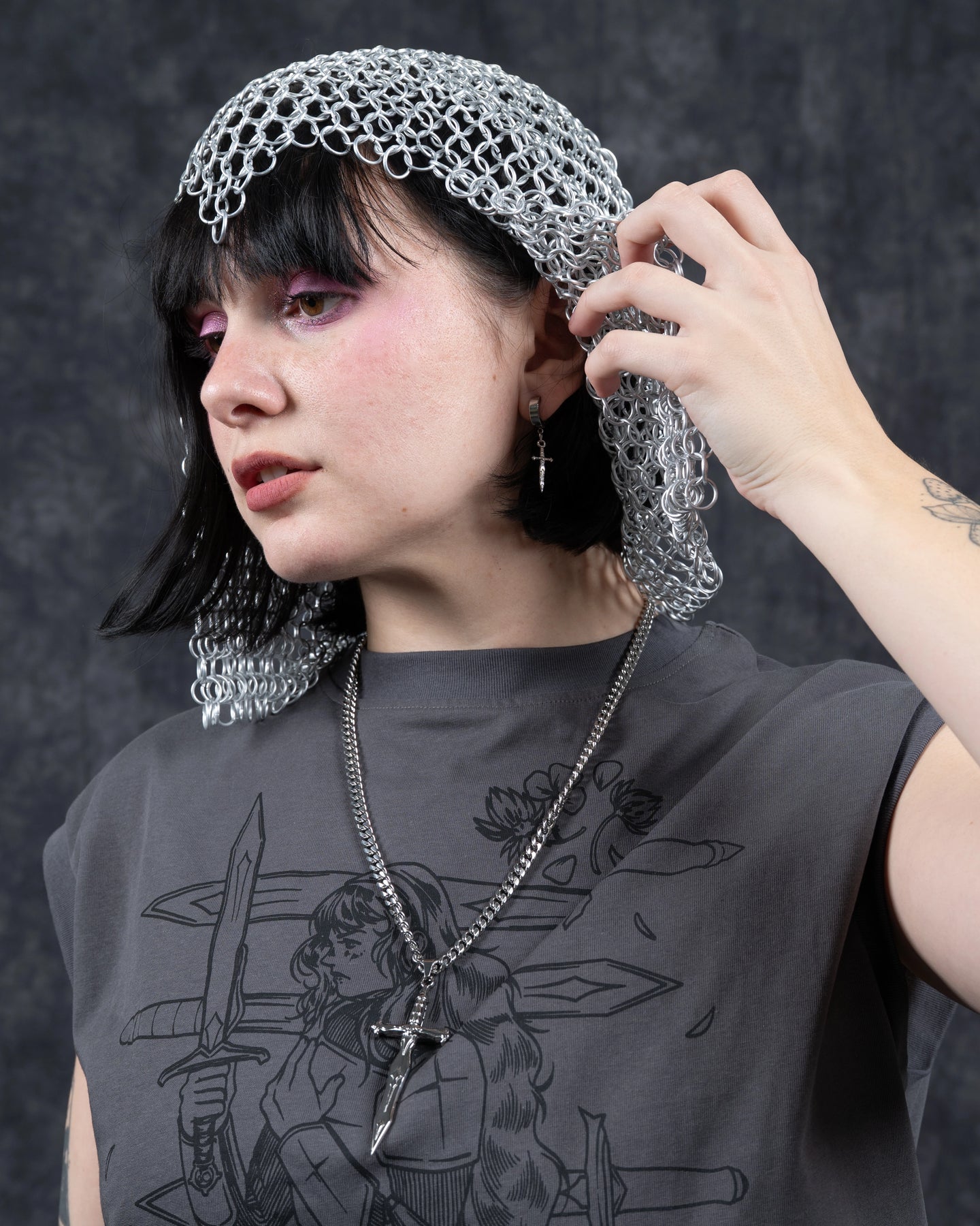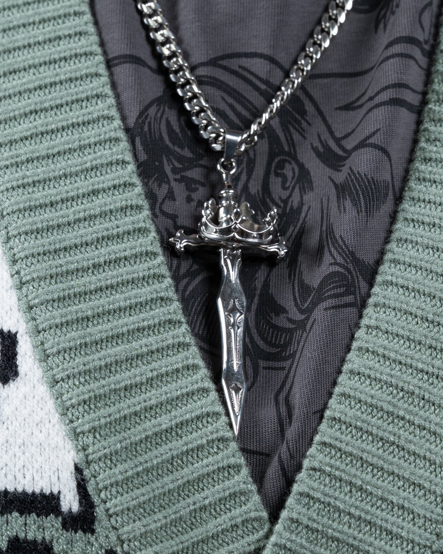 Our take on a sword meant for Jeanne d'Arc. Can either be worn independantly as a necklace, or styled with the Crown Ring atop the hilt of the sword, in the style of her coat of arms.
